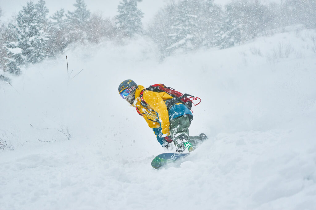 The drawn-out line of snowboarders beside me starts to peel off, dropping down into the powder with a cascade of whoops, firing huge rooster tails up behind them and disappearing into monstrous white clouds every time they put in a hard, heel-edge turn.